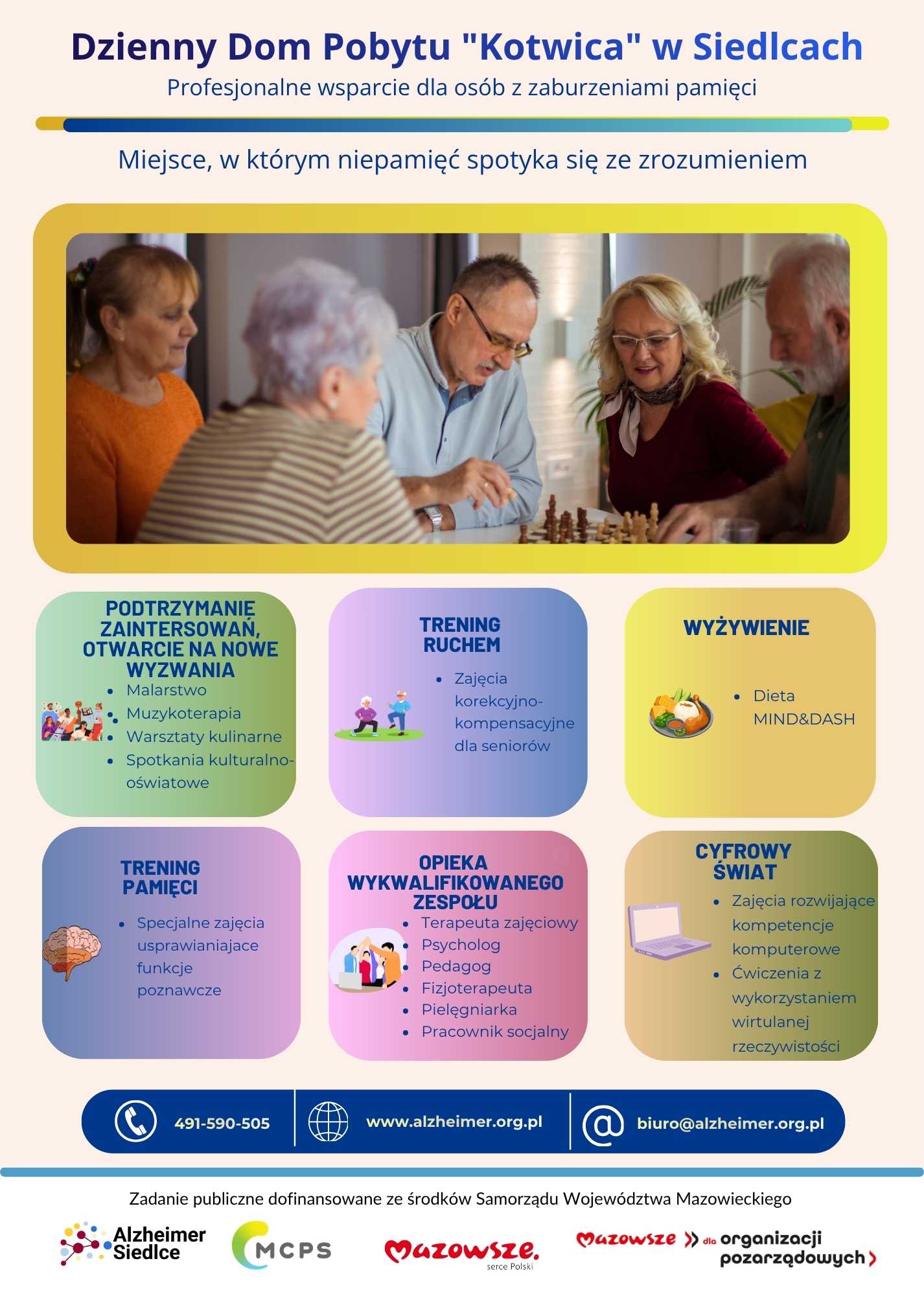 Zapraszamy do udziału w zajęciach prowadzonych w ramach Dziennego Domu Pobytu KOTWICA dla osób starszych z chorobami otępiennymi, w tym chorobą Alzheimera w Siedlcach.